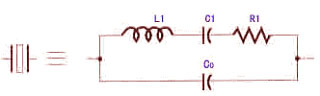 如下图所示在谐振频率附近,晶体的等效电路由下列参数动态电感L1,动态电容C1及串联支路中描述晶体机械振动的串联电阻R1和由支架杂散电容与两平行电极之间的静电容之和所构成的静态电容C0来描述