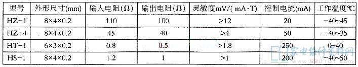 图中的“×”表示磁场的方向指向纸面,E是直流电源,R用来调节控制电流的大小,RL为负载电阻,电流I的两端为输入端,其内阻为输入电阻,I一般为几十至几百毫安,EH所接两端为输出端,其内阻为输出电阻。国产霍尔元件主要有HZ、HT、HS系列等,主要参数如附下表所示