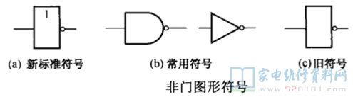 图所示是由三极管组成的非门电路。由图可知,当输入端为低电平时,三极管V截止,输出为高电平;当输入端为高电平时,三极管V饱和导通,输出为低电平。因此,非门只有一个输入端、一个输出端。逻辑功能是“有0出1,有1出0”非门电路的逻辑表达式为Y=