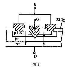众所周知,传统的MOS场效应管的栅极、源极和漏极大大致处于同一水平面的芯片上,其工作电流基本上是沿水平方向流动。VMOS管则不同,从图1上可以看出其两大结构特点:第一,金属栅极采用V型槽结构;第二,具有垂直导电性。由于漏极是从芯片的背面引出,所以ID不是沿芯片水平流动,而是自重掺杂N+区(源极S)出发,经过P沟道流入轻掺杂N-漂移区,最后垂直向下到达漏极D。电流方向如图中箭头所示,因为流通截面积增大,所以能通过大电流。由于在栅极与芯片之间有二氧化硅绝缘层,因此它仍属于绝缘栅型MOS场效应管。