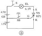 为了能够直观地认识晶闸管的工作特性,大家先看这块示教板(图3)。晶闸管VS与小灯泡EL串联起来,通过开关S接在直流电源上。注意阳极A是接电源的正极,阴极K接电源的负极,控制极G通过按钮开关SB接在3V直流电源的正极(这里使用的是KP5型晶闸管,若采用KP1型,应接在1.5V直流电源的正极)。晶闸管与电源的这种连接方式叫做正向连接,也就是说,给晶闸管阳极和控制极所加的都是正向电压。现在我们合上电源开关S,小灯泡不亮,说明晶闸管没有导通;再按一下按钮开关SB,给控制极输入一个触发电压,小灯泡亮了,说明晶闸管导通了。这个演示实验给了我们什么启发呢?
