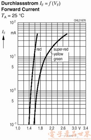 对于高达10mA的正向电流,正向电压变化很大。其变化范围800mV左右(某些二极管型号甚至变化更大)。因此,电池放电引起的工作电压变化会改变光色,这是因为工作电压变化会改变正向电流。在10mA正向电流时,正向电压为3.4V左右(此数值随制造商不同而异,范围为3.1V~4.0V)。对于不同LED,其电流-电压特性也呈现出很大差异。LED直接由电池供电工作是困难的,因为,大多数电池的放电态低于LED所需的最小正向电压。