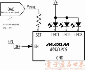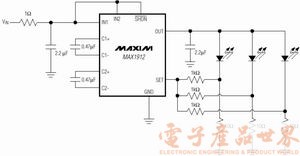 若系统能提供高于二极管正向电压的电压,则很容易使白光LED工作。例如,数码相机通常包含+5V电源。这样就不需要升压功能,因为电源电压具有驱动LED的足够容限。对于图8的电路,应选择匹配电流源。做为一个实例,MAX1916可以驱动3个并联的LED(图9)。