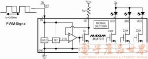 图9 单个外电阻器(RSET)可编程MAX1916加到每个LED上的相同电流。加PWM信号到使能引脚可产生简单的亮度控制(降低亮度功能)