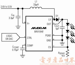 除了上面提供的电荷泵(MAX1912)外,也可以用带电流控制的升压变换器实现。例如开关电压变换器MAX1848可产生高达13V的输出电压,此电压驱动3个串联LED(图11)是足够的。此方法也许是最健全的,因为所有二极管是串联的,具有完全相同的电流。RSENSE和加在CTRL输入的电压确定LED电流。