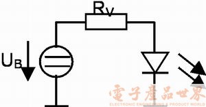 使LED工作的最简单方法是把电压源通过一个串联电阻加到LED上。只要工作电压(VB)保持恒定,LED会发射恒定强度的光(虽然光强随环境温度增高会减弱)。可以根据要求改变电阻值来变化光强。