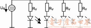图2 串联电阻器和恒压源为LED工作提供一种简单方法