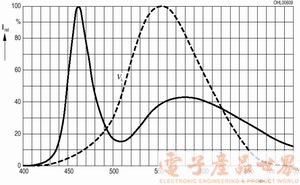 图4 白光LED发射波长(实线)包含蓝光和黄光区域的峰值,被人眼视为白光(图中的虚线为人眼相对光灵敏度)