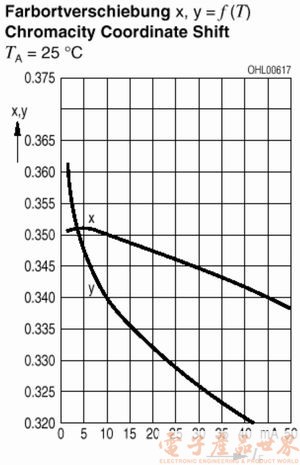 因为白光是不同波长的混合,所以,白光LED不可能有一个特定波长。用色坐标定义白光LED。根据CIE(Commission Internationale De L,eclairage)15.2版计算X和Y 坐标。往往在白光LED数据手册中给出色坐标随正向电流增加而变化(见图5)。可惜,InGaN LED处理起来不像标准绿光、红光和黄光LED那样容易。