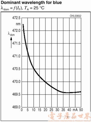 InGaN LED的主波长(彩色)随正向电流而变化(图6)。例如,在白光LED中,除了发蓝光InGaN材料波长随正向电压变化外,变换材料的不同密度也产生色移。从图5可见这种色变化,X和Y坐标改变意味着色变化。如前所述,白光LED不具有一个特定的波长。
