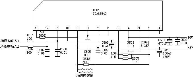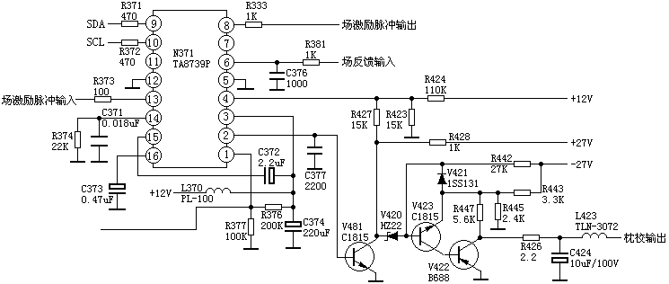 该电路摘自金星D2908F1脚:0.3V——2脚:7.9V——电流反馈输入3脚:8.4V——电压变换输入4脚:16V——电源5脚:8.4V——电压输出端(下)6脚:0V——地7脚:48V——电源8脚:0V——地9脚:8.4V——电压输出端(上)10脚:16V——电源11脚:1.2V——场推...