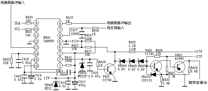 场激励脉冲信号直接加到N402(TA8859)的(13)脚,触发内部单稳态触发器,产生脉冲宽度恒定的场频脉冲,经整形后去控制场锯齿波形成电路,使N402(15)脚外接锯齿波形成电容C418恒流充电,形成锯齿波电流。锯齿波的幅度和充电速度受N402的AG...