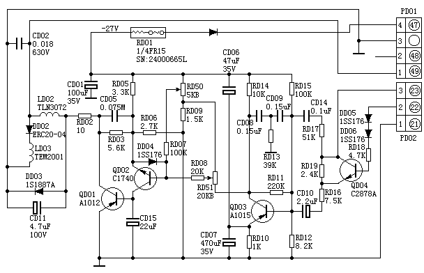 TDA6107内藏三路独立的视频放大电路,具有暗电流检测功能,既可输入R、G、B三基色信号,也可输入R-Y、B-Y、G-Y、Y三基色色差信号,图示为输入R、G、B三基色信号时的应用图。1脚:2.3V——R(或R-Y)信号输入2脚:2.3V——G(或G-...