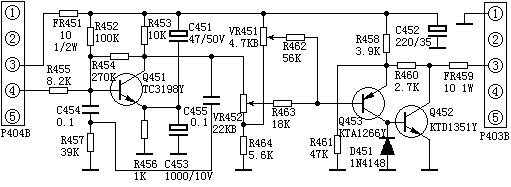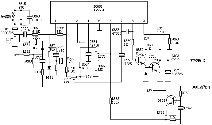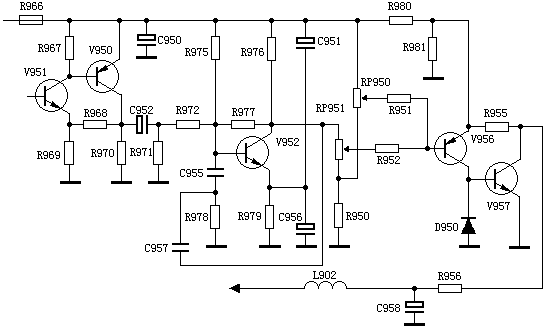 该电路摘自金星D2918机型枕校电路,和枕校电路-1相比,仅多了V951、V950两级放大,其原因是场锯齿波不是取自场偏转线圈取样电阻,而是从TDA8838的(46)脚取得,因幅度较小,所以加了两级放大。 ...