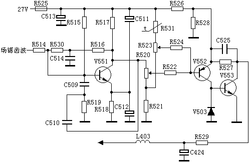 场锯齿波信号由R514送入V551的基极,经R516、C514积分,C510、R519、C509、V551的E-B极微分,形成抛物波信号,再经V552放大后从集电极输出,直接送到V553的基极,从V553集电极输出的抛物波信号经R529、L403加在V...