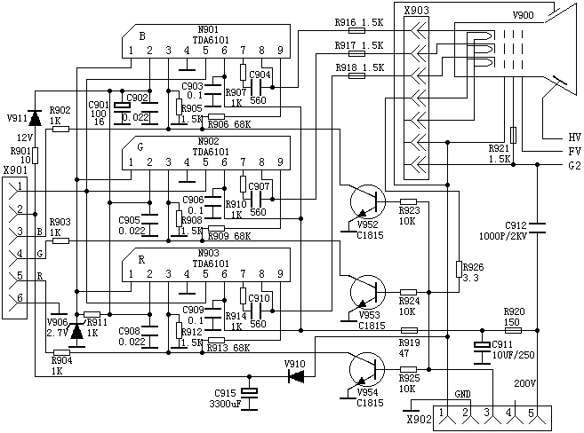 TDA6101为宽带视频放大电路,视频带宽达9MHz,一般用于较高档的机型中。1脚:2.7V——基准电压2脚:12V——电源3脚:2.6V——信号输入端4脚:0V——地5脚:6.7V——暗电流信号输出6脚:200V——电源7脚:130V——交流信号输出...