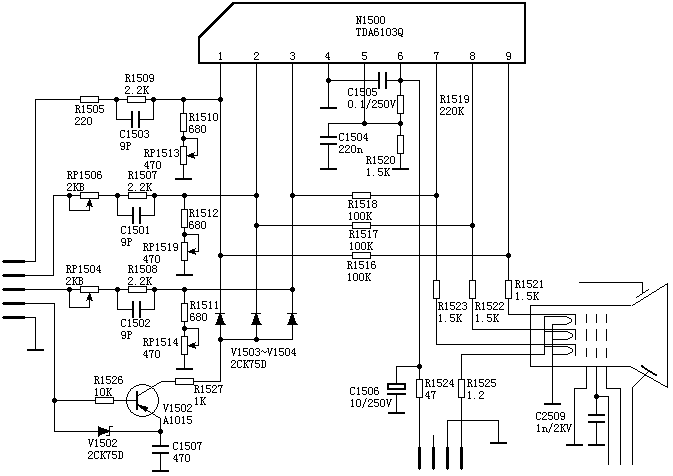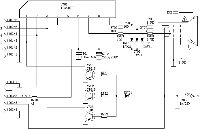 TDA6103内含三组视频输出放大器,视频带宽达7.5MHZ,内设过热保护、防CRT跳火保护,图为TDA6103在长虹D2191机型上的应用。 TDA6103的(1)、(2)、(3)脚为R、G、B输入脚,(7)、(8...