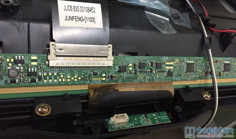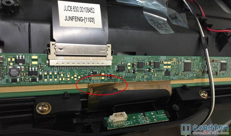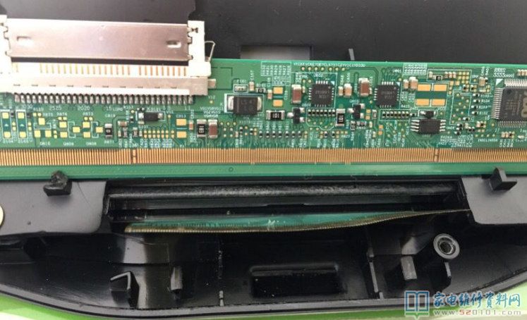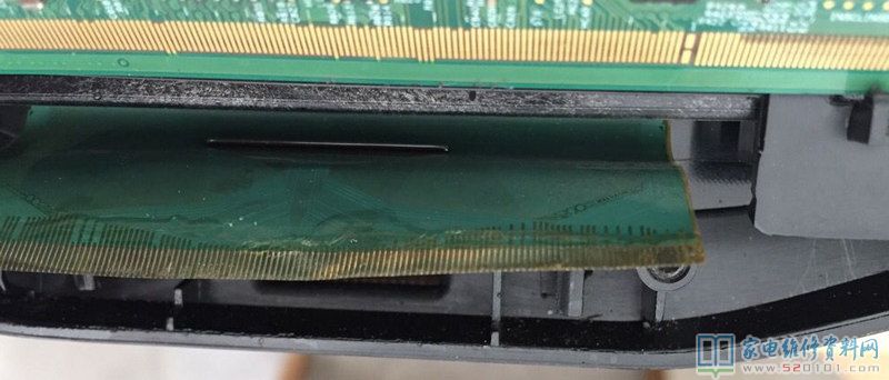 接修一台长虹32寸液晶电视,出现PCB端排线脱落(如下图所示),由于没有其他压屏等专业设备,只能手工进行焊接了,可能有朋友怀疑上不了锡,其实可以上锡的,那个是铜泊。原表面有印刷碳层。排线胶是可以直接用铬铁焊的不易坏;要准备一个40倍的双目显微镜,焊接的时候要胆大心细,一定要有耐心;打开热风枪200度左右,吹下排线。清理排线和板上焊点,注意清理时刀刃顺着铜箔条的方向,用力适当,以免划伤焊点。平头烙铁200度左右PCB板和排线焊点上锡,上锡时加足焊油。上锡后清理干净PCB和排线焊点,在PCB板上均匀涂上少许焊油。对好焊接位,平头烙铁300度左右,排线背面加热焊接。操作时注意烙铁温度一定不能太高,以免损坏焊盘和排线。