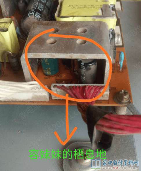 接修一台长虹LT32710液晶电视,此机为LCD背光,以为又要改背光了,开机发现没背光,屏里也没有隐约图像,可是有声音,故障点又由背光一下转移到了电源板上,开盖检查,直奔24V测试点,果然电压只有19V,电压低首先就想到了电容,但是电容全部躲在散热片下,已有四颗电容处于鼓包状态,35V/470uF,由于手头上没有,到旧板拆了两个,实在找不到了,另外两个用一个35V/1000uF的代换,开机,24V正常,故障修复。