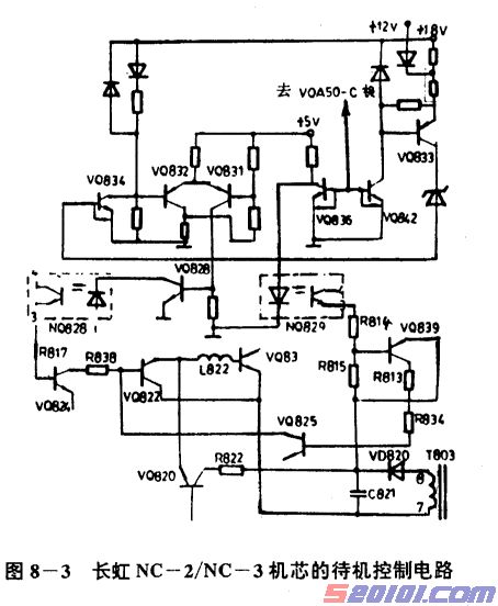 待机状态时,微处理器的(31)脚输出高电平+5V,VQ836 截止,VQ834 截止,VQ871
