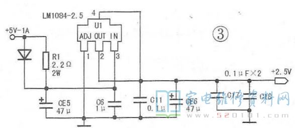 该系列稳压块的型号非常多,如A1084-XX、G1084-XX、L1084-XX、M1084-XX、LM1084-xx等,后缀数字表示稳压输出的电压值,如"LM1084-2.5”,表示其稳压输出电压为2.5V,其应用电路如图3所示;标有"ADJ"字样者表示输出电压可调,具体值由①脚外接的分压电阻阻值决定,如图4所示,输出电压Vour=1.25VX(1+R2/R1)。