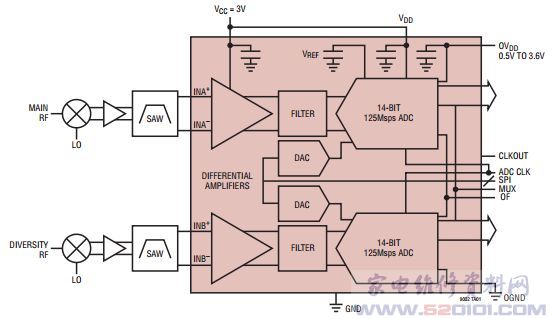 概述:LTM9002采用15mm x 11.25mm LGA 封装,该器件运用一种集成系统级封装(SIP)技术,包括一个双通道高速14位A/D转换器、匹配网络、抗混叠滤波器和两个低噪声、差分放大器。它专为对具有一个高达300MHz中频(IF)的宽动态范围信号进行数字化处理而设计。放大器可提供AC或DC耦合输入驱动。可以实现具有不同带宽的低通或带通滤波器网络。