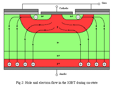 以发射极为参考,当栅电压高于VTH时,会在栅下方的P区形成电子的导电沟道。MOS管导通。两块绿色区域夹着的P这个整体构成MOS。两个红色和中间的绿色构成PNP三极管,MOS导通后,相当于能够提供三极管的基极电流,使三极管导通。电流流向如图二
