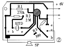 传统的直接检波式收音机的方框图如图3(a)所示。这种收音机中的使用由电感及可变电容组成的LC调谐回路,可变电容使用日久后,在灰尘、静电等因素的影响下,会使调谐电台时经常有“咔唰咔唰”的噪声,令人讨厌。另外,为了直观地指示出收听的频率,还要使用复杂的易出故障的接线机构。用变容二极管来取代LC调谐回路中的可变就能克服以上缺点,而且还具有安装容易、分布参数影响小、容易实现调谐数字化与智能化其优点。采用变容二极管进行调谐的直接检波式收音机方框图如图3(b)所示。电位器W用来改变调谐电压。调谐电压经电阻R后加至变容二极管DC1上。通过改变调谐电压改变DC1的结电容,即可改变调谐频率。R为隔离电阻,防止调谐回路对地或Vcc短路,一般取值为10kΩ~1MΩ。C为隔直电容,一般可取0.01μF~0.47μF。