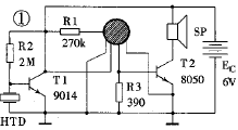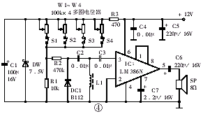 采用变容二极管的简易电调谐中波收音机如图4所示。变容二极管DC1与天线线圈电感L1共同组成输入调谐回路。W1~W4组成频调电位器,由其向变容二极管提供工作偏压。S1~S4为四位互锁式按键开关。调谐回路选出的电台信号经集成电路LM386N内部检波放大后,推动扬声器SP发声。