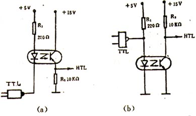 图(b)中,则是利用TTL截止输出高电平,发光二极管导通,光电三极管输出低电平;TTL导通输出低电平,发光二极管截止,光电三极管输出高电平。