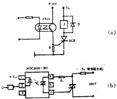 图46—6中(a)所示电路为光耦合器构成的可控硅开关电路。可控硅SCR的触发电压取自电阻R,其大小由通过光电三极管的电流决定,直接由输入电压控制。该电路简单,控制端与输出端有可靠的电隔离。