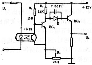 图46—8中(b)所示电路为光电耦合开关的施密特电路。当输入电压U1为低电平时,光电三极管C、e间呈高电阻,BG1导通,BG2截止,则输出电压U0为低电平;当输入电压U1大于鉴幅值时,光电三极管c、e间呈低电阻,则BG1截止,BG2导通,输出的电压U0为高电平。调节电阻R3,即改变鉴幅电平。