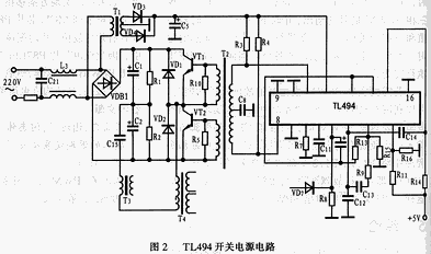 图2是由TL494组成的计算机开关电源电路(只画出了脉宽控制振荡电路),图中的TL494工作在推挽输出方式,并接成共发射极形式,由8脚和11脚输出的脉冲信号T2耦合主开关三极管VT1和VT2,可使它们处于它激振荡状态。