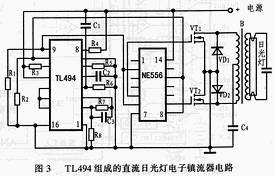 图3是由TL494组成的直流日光灯电子镇流器电路,采用推挽输出方式并接成射极跟随器形式。由9脚和10脚输出的脉冲先输入至NE556电路的12、8和2、6脚,再由NE556电路的5、9脚输出脉冲信号来驱动VT1和VT2两个CMOS场效应管。