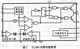 TL494的内部功能框图如图1所示。其引脚功能如下: