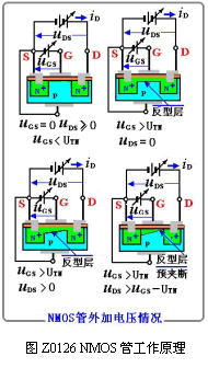 曲线为例来进行分析。设UGS >VT,导电沟道已形成。当UDS= 0时,沟道里没有电子的定向运动,ID=0;当UDS>0且较小时,沟道基本保持原状,表现出一定电阻,ID随UDS线性增大 ;当UDS较大时,由于电阻沿沟道递增,使UDS沿沟道的电位从漏端到源端递降,所以沿沟道的各点上,栅极与沟道间的电位差沿沟道从d至s极递增,导致垂直于P型硅表面的电场强度从d至s极也递增,从而形成沟道宽度不均匀,漏端最窄,源端最宽如图Z0126所示。随着UDS的增加,漏端沟道变得更窄,电阻相应变大,ID上升变慢 ;当UDS继续增大到UDS =UGS - VT时,近漏端的沟道开始消失,漏端一点处被夹断;如果UDS再增加,将出现夹断区。这时,UDS增加的部分基本上降在夹断区上,使夹断部分的耗尽层变得更厚,而未夹断的导电沟道不再有多大变化,所以ID将维持刚出现夹断时的数值,趋于饱和,管子呈现恒流特性。