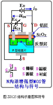 图Z0125是N沟道增强型MOS管的结构示意图和符号。它是在一块P型硅衬底上,扩散两个高浓度掺杂的N 区,