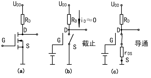 ※ uGS>开启电压UT:MOS管工作在导通区,漏源电流iDS=UDD/(RD+rDS)。其中,rDS为MOS管导通时的漏源电阻。输出电压UDS=UDD·rDS/(RD+rDS),如果rDS<<RD,则uDS≈0V,MOS管处于"接通"状态,其等效电路如图3.8(c)所示。