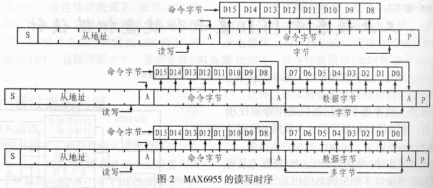 对MAX6955的读写操作是通过命令寄存器地址完成的,第一个字节是命令字节(实际上是寄存器地址),它决定着第二个字节的数据写入哪个寄存器或者从那个寄存器读取数据,如果命令字节后面没有数据,则MAX6955不执行操作。如果命令字节后面有多个字节的数据,MAX6955内部的寄存器地址自动累加,这样可以缩短MAX6955的读写时间。图2给出了MAX6955的读写时序。