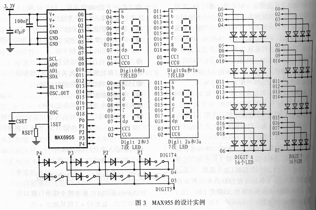 图3给出了用MAX6955设计LED显示和键盘扫描电路的一个具体实例。该方案可实现8个按键扫描、32个独立LED指示灯显示以及8位7段LED显示。