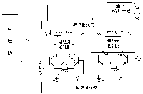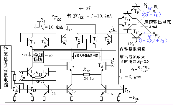 说明差模输出电流是一个隐函数,因此在υx满量程为lV时,υx非线性误 差高达4%, 因此必须加入失真抵消电路; C)输出级采用电流放大器,适应于基本无摆幅的电流相乘器,它属于跨导型。2)简化原理电路与外部连接图 简要原理图