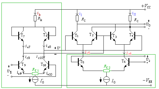 2)电路构成: ◆T1~T4,T7、T8构成流控吉尔伯特电路,实现ic=iI-iII∝(ic5-ic6)(ie7-ie8) ◆由T9、T10、RE1与T5、T6、RE2分别构成电流-电压线性转换器。 |