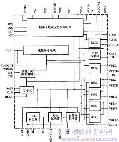 含有6个低压差(LDO)线性电压稳压器,以履行电源管理。一个稳压器由IC的供电开/关(ON/OFF)逻辑驱动,并结合微控制器复位功能。另外5个低噪声稳压器包含各自的可编程输出电压和使能截止(EnabledISAble)。TWL2213可从电池或AC适配器加电。器件同时还包含分别可选择的LED背光驱动器、振铃器(ringer)及振动器(Vibrator)驱动器。一个内部8位ADC可从外部脚进入。系统微控制器存取IC全部编程,状态经由I2C串行接口。