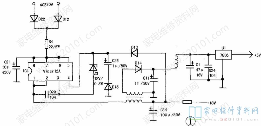 一台奔腾PC18D电磁炉,保险管(12A)完好,加电无任何反应(见图1)。电磁炉保险管完好,一般证明机内高压部分无严重短路,引起电磁炉无任何反应的原因有:1.交流220V未加入到机内,说明电源线断;2.低压控制电压部分元件损坏,无18V、5V电压;3.晶振坏,CPU内部电路不能正常工作;4.CPU本身损坏。