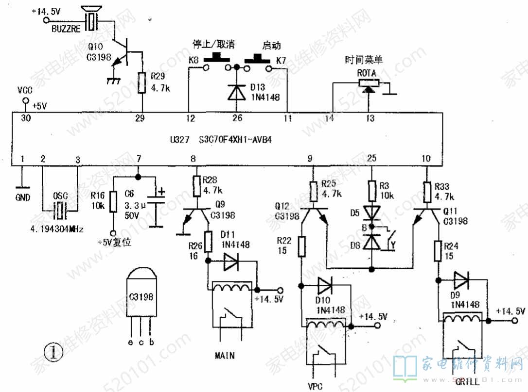 拆开上盖,看交流保险完好(但不能说明高压部分无问题),试通电,面板有显示,扭动时间菜单电位器,显示器有变化。按“停止/取消”键,蜂鸣器有叫声,但按启动按钮不能开机。断电,先检查微波管、高压二极管、散热风扇、门控开关、高压电容等元件,均在正常范围之内,看来故障源应在控制电路板上。取下电路板上的四组连线,焊下微波管及微波控制用的零线B、Y(见图1),将一根带保险的电源线与控制变压器初级相接,先通电测其低压控制电源的情况,此低压供电共分三路: 一路为6V给显示器供电;一路为14.5V为继电器、蜂鸣器供电;另一路则是由14.5V变为5V,供CPU工作和复位用。