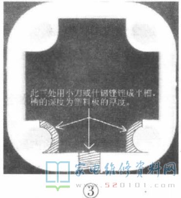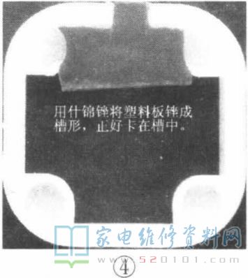 然后将塑料板也做成相应的形状使其正好嵌入到白色塑料件上开的槽里(因手中无合手的工具,所以塑料板形状做得不规则),形成三点支撑,见图4。