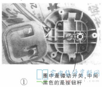 取下这个白色塑料件,发现白色塑料件两个对角的下面分别有两个弹簧。在白色塑料件的“舌头”下面有个微动开关,原来,这个“舌头”是用来控制微动开关的,见图1。