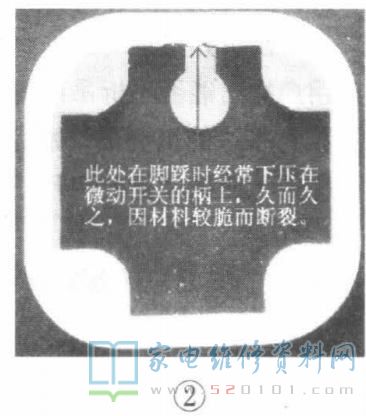 当人站到秤盘上时,白色塑料件随之压下,“舌头”压在微动开关的按钮杆上,使开关导通,接通电源,液晶屏显示重量的数值。当撤去重力后,弹簧将白色塑料件弹起,微动开关断开。当取下白色塑料件时,发现这个“舌头"已经断裂,见图2,只有一点点连在白色塑料上,用手一动,“舌头”就掉下来了。打开另一只后脚,情况完全一样。也是这个“舌头”断了,导致重力下压时无法按动微动开关,电路无电,液晶屏不显示。