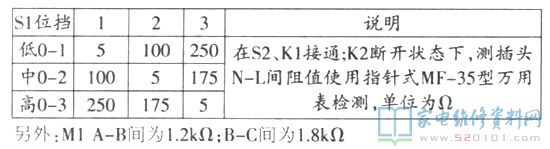 7.风力小。电扇风力大小主要与电机转速有关,如调速开关S1控制状态正常,主要涉及供电电压和电机M1本身的力矩。外部供电容易判断,M1的好坏就是查绕组线包内有无受潮局部短路和开路现象。为了能准确地快速判断M1,可以选用精度比较高的万用表欧姆挡,检测图1中在路各关键测试点的正常电阻值,如附表所列供参考,若误差大,断定M1有损坏,再拆卸更换。