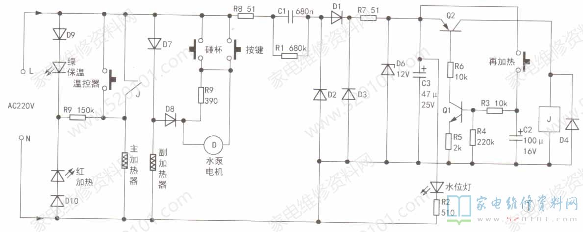 控制水泵电机有两个开关:一个是碰杯开关,把杯子往上顶就能出水;另一个是手动按键出水,水泵供电也采用半波整流方式。当L线为+.N线为-时,D7导通,副加热器得电工作,水泵电机失电;当N线为+、L线为一时,D8导通,水泵得电,这时的副加热器实际上是水泵电机的限流电阻,所以副加热器的阻值要和水泵的工作电流相匹配。调整R9的阻值,可以适当改变通过水泵电机的电流大小。R8、C1、R1和D1、D2组成阻容降压半波整流电路,R7、C3和D6是滤波和稳压电路,输出12V电压,通过Q2供给继电器,平时J不吸合,当按下再加热按键时, 12V电压给c2充电,Q1因通过R3得到偏置电压而导通,Q2随即导通J得电吸合,主加热器工作;当手离开按键后,由于c2两端电压不能突变,所以Q1维持导通,当c2两端电压降到一定值时,Q1截止,Q2也截止,J释放,补充加热结束。Q1发射极所接电阻R5的作用是提高Q1基极的输入阻抗,增加Q1延时导通的时间。实测J延时释放时间约为15s。